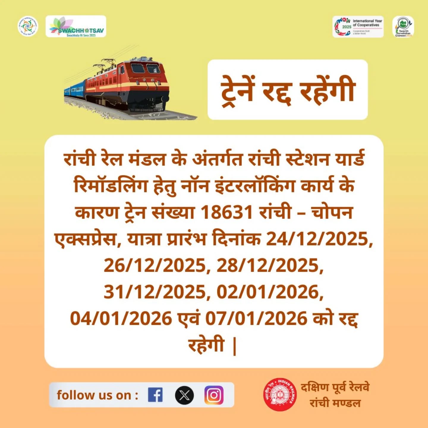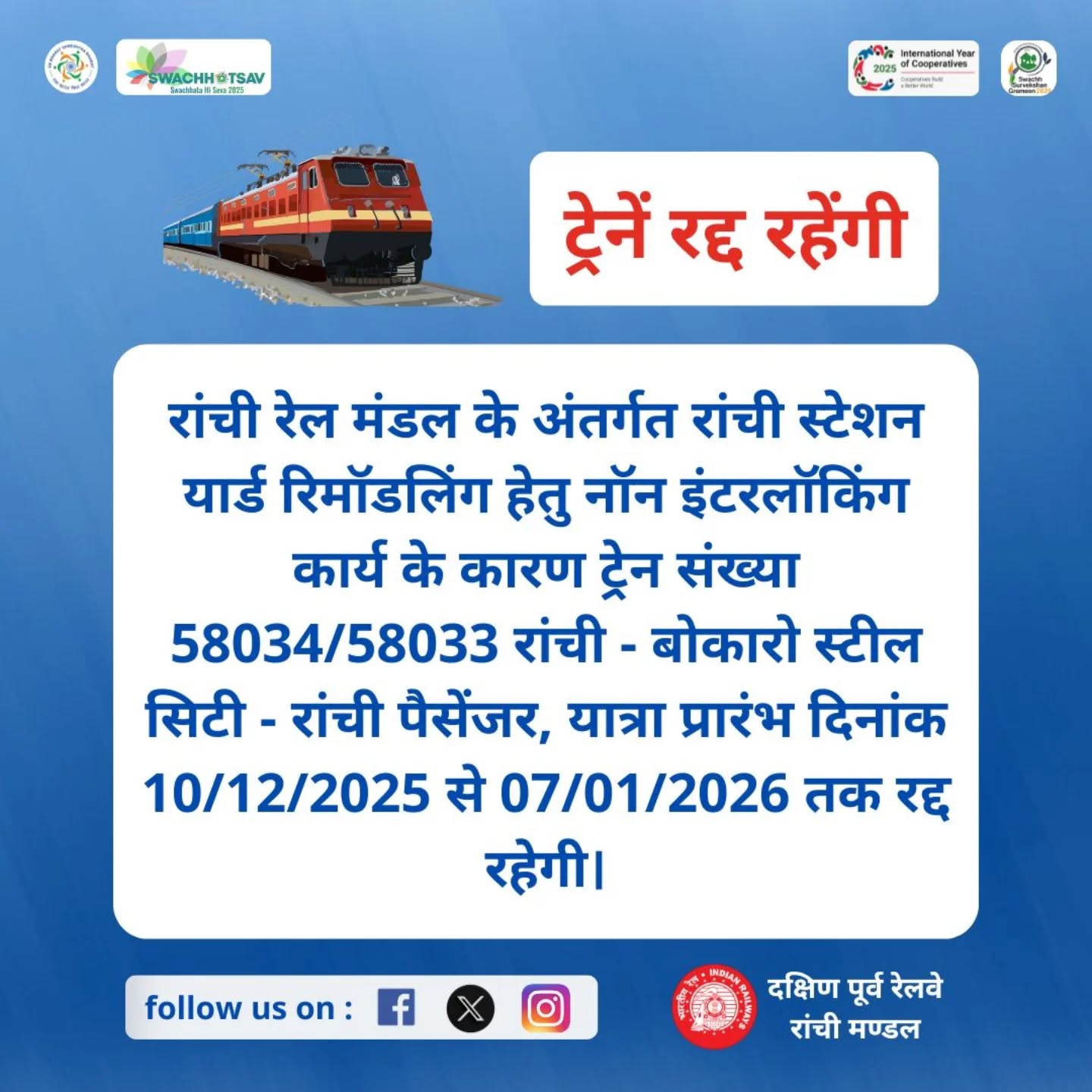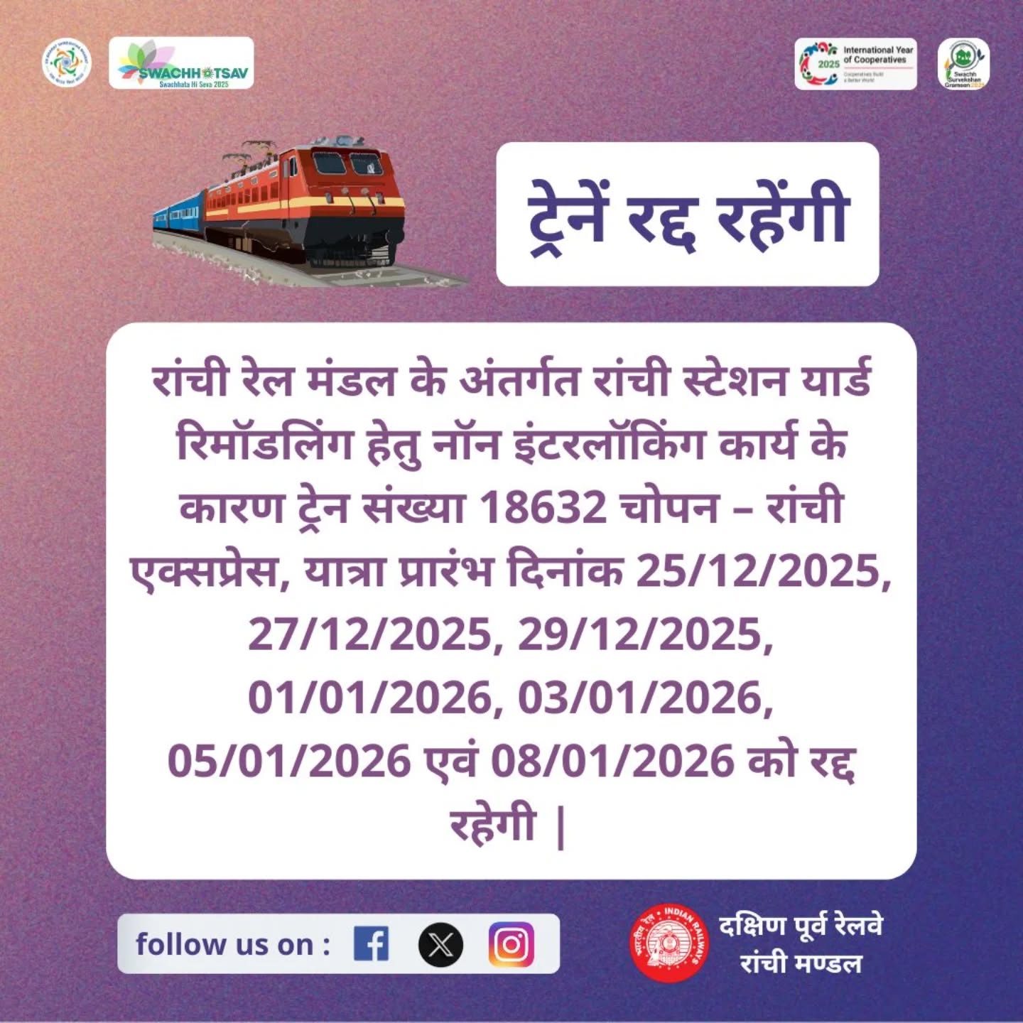 रांची स्टेशन में होने वाले बड़े यार्ड रीमॉडलिंग कार्य के कारण आने वाले दिनों में दर्जनों ट्रेनों का संचालन प्रभावित रहेगा। दक्षिण पूर्व रेलवे ने जानकारी दी है कि 10 दिसंबर 2025 से 7 जनवरी 2026 तक Pre Non-Interlocking और Non-Interlocking कार्य किए जाएंगे, जिससे स्टेशन पर रूट डायवर्जन, रद्दीकरण और शॉर्ट टर्मिनेशन जैसी व्यवस्थाएँ लागू की जाएँगी। रेलवे ने यात्रियों से आवश्यकतानुसार यात्रा योजना बदलने की अपील की है।रेलवे के अनुसार, Pre-NI कार्य 10 दिसंबर से 5 जनवरी तक तथा NI कार्य 6 और 7 जनवरी 2026 को होगा। इन महत्वपूर्ण तकनीकी कामों का उद्देश्य रांची रूट पर परिचालन क्षमता में वृद्धि करना और ट्रेनों की सुरक्षा सुनिश्चित करना है।