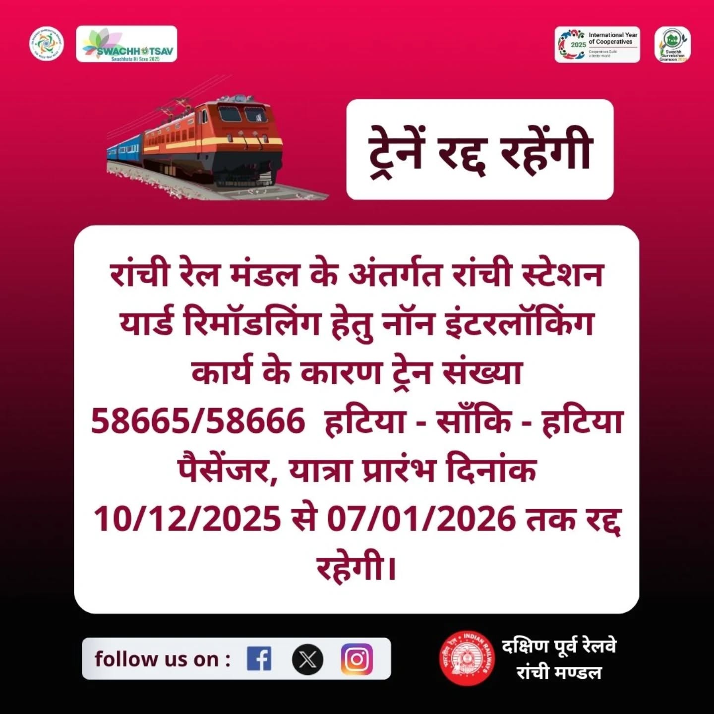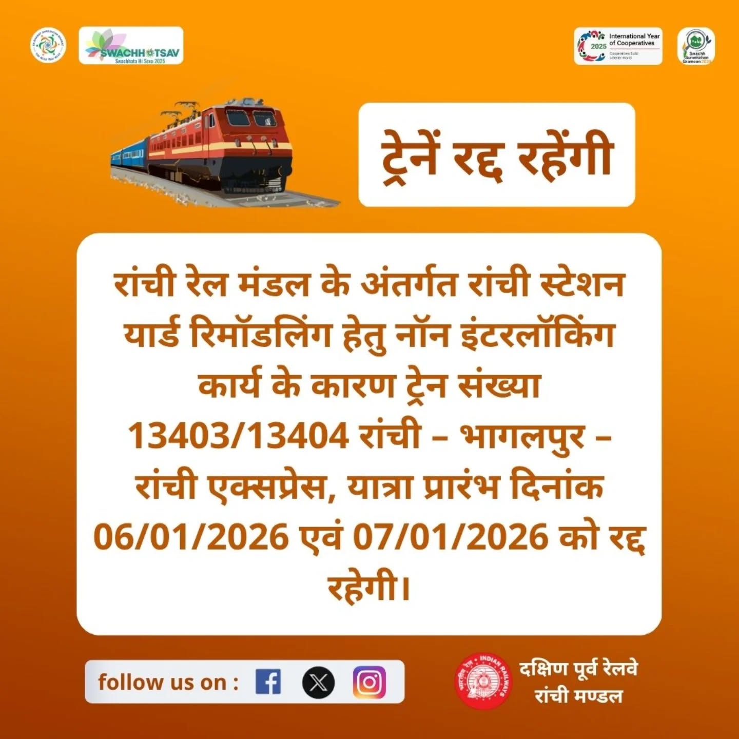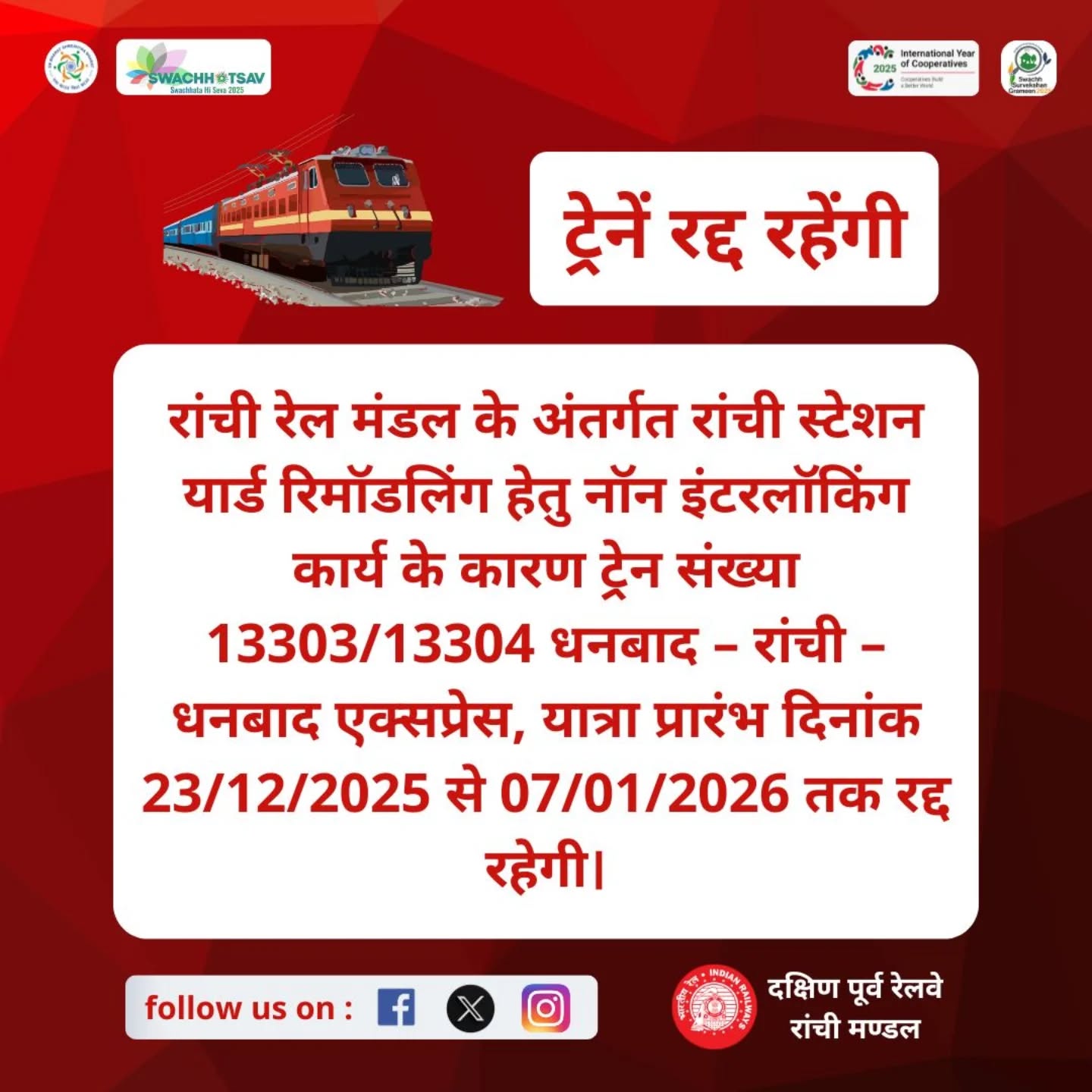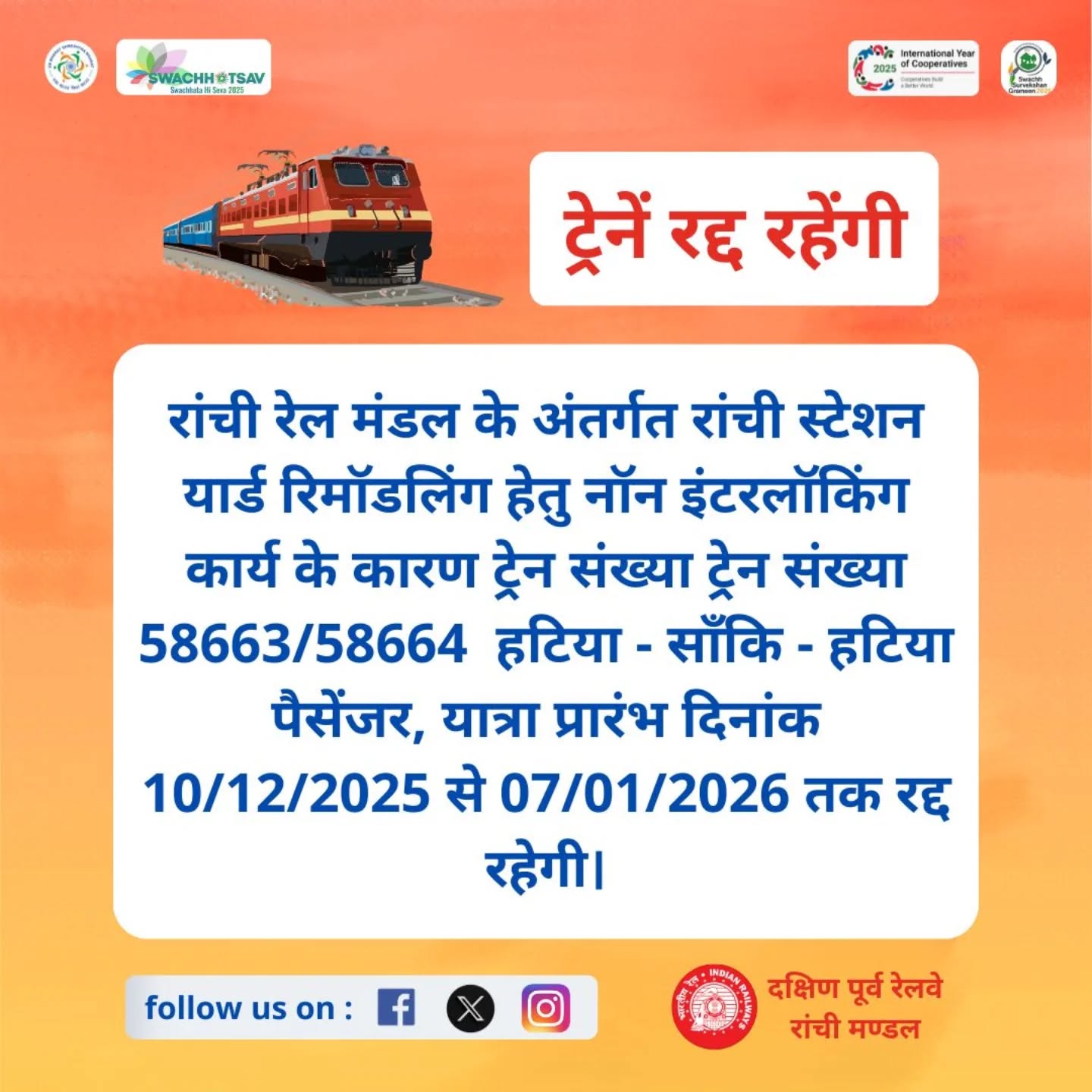 रांची स्टेशन में होने वाले बड़े यार्ड रीमॉडलिंग कार्य के कारण आने वाले दिनों में दर्जनों ट्रेनों का संचालन प्रभावित रहेगा। दक्षिण पूर्व रेलवे ने जानकारी दी है कि 10 दिसंबर 2025 से 7 जनवरी 2026 तक Pre Non-Interlocking और Non-Interlocking कार्य किए जाएंगे, जिससे स्टेशन पर रूट डायवर्जन, रद्दीकरण और शॉर्ट टर्मिनेशन जैसी व्यवस्थाएँ लागू की जाएँगी। रेलवे ने यात्रियों से आवश्यकतानुसार यात्रा योजना बदलने की अपील की है।रेलवे के अनुसार, Pre-NI कार्य 10 दिसंबर से 5 जनवरी तक तथा NI कार्य 6 और 7 जनवरी 2026 को होगा। इन महत्वपूर्ण तकनीकी कामों का उद्देश्य रांची रूट पर परिचालन क्षमता में वृद्धि करना और ट्रेनों की सुरक्षा सुनिश्चित करना है।