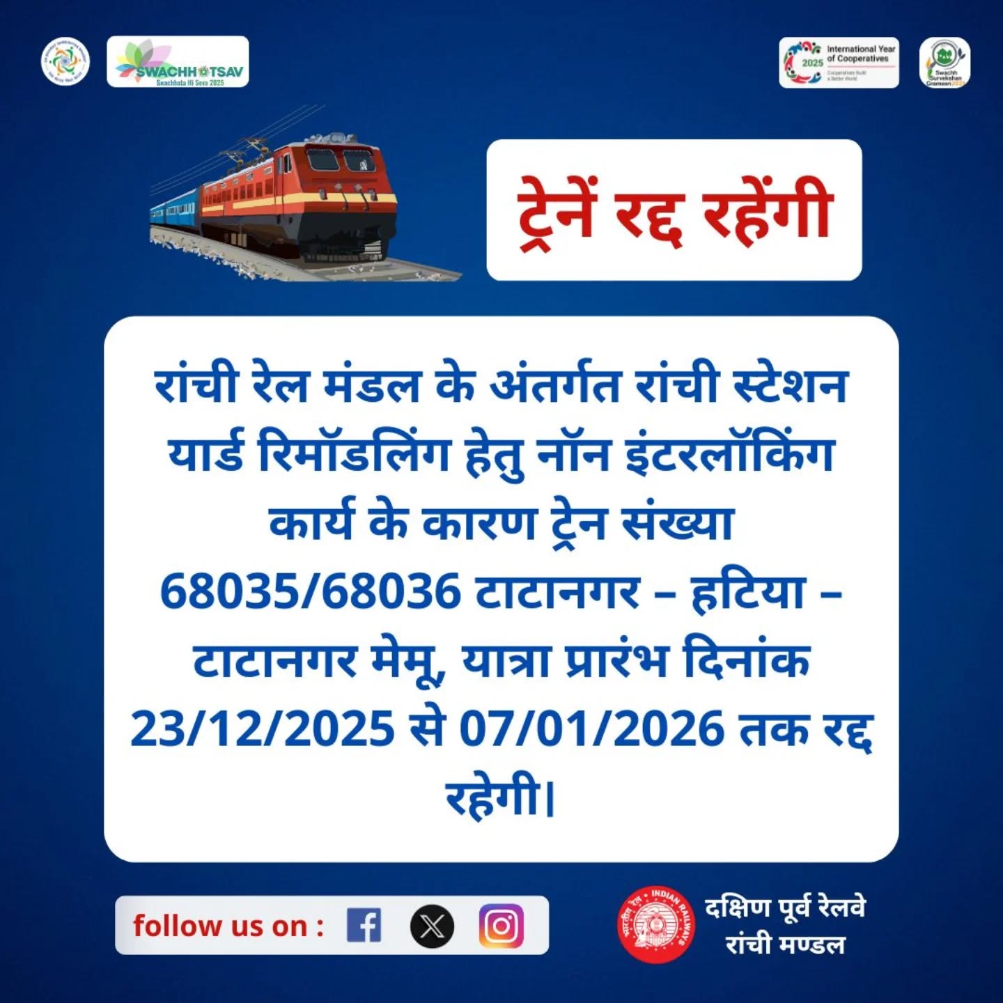 68035/68036 टाटानगर–हटिया–टाटानगर मेमू (23 दिसंबर से 7 जनवरी)