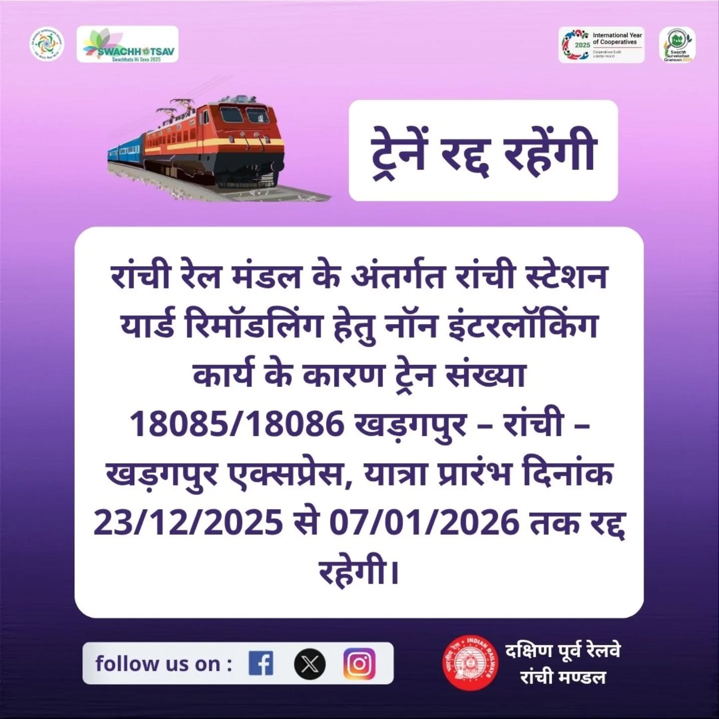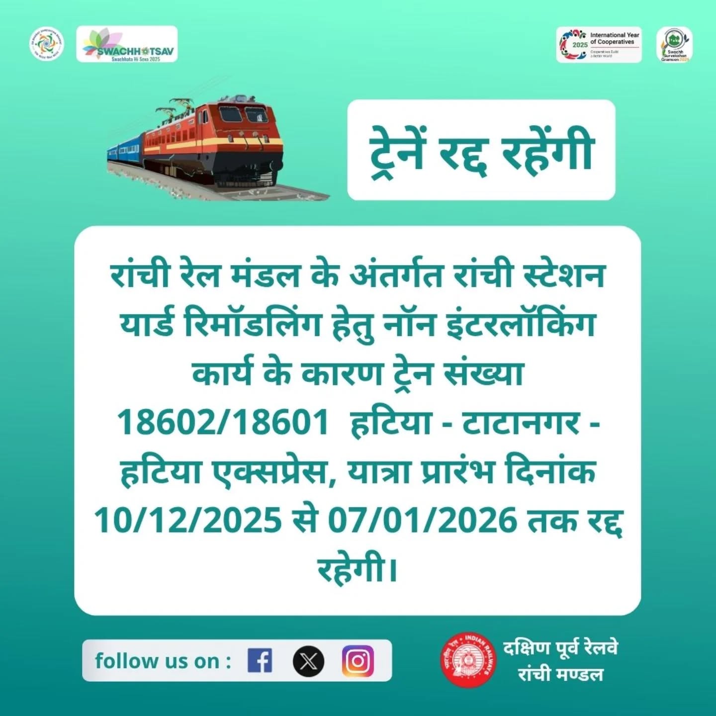 - इस अवधि में रांची की ओर जाने वाले यात्रियों को अपने यात्रा कार्यक्रम की पहले से जांच कर लेने की सलाह दी गई है, ताकि किसी भी असुविधा से बचा जा सके। रेलवे ने कहा कि ट्रेनों की स्थिति, रद्दीकरण और समयसूची से संबंधित सभी अपडेट IRCTC और NTES ऐप पर उपलब्ध रहेंगे।यार्ड रीमॉडलिंग पूरा होने के बाद रांची स्टेशन पर ट्रेन संचालन पहले से तेज और अधिक सुरक्षित होगा। रेलवे के अनुसार, यह काम लंबे समय से लंबित था, जिसे अब आधुनिक तकनीक के साथ पूरा किया जा रहा है।