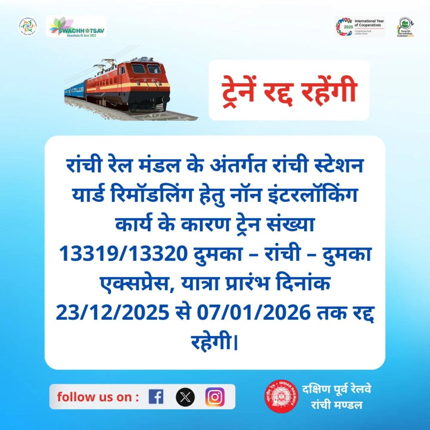13319/13320 दुमका–रांची–दुमका एक्सप्रेस (23 दिसंबर से 7 जनवरी)