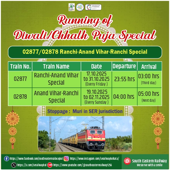 02877 Ranchi-Anand Vihar Special will leave Ranchi on every Friday from 17.10.2025 to 31.10.2025 at 23:55 hrs and will reach Anand Vihar at 03:00 hrs, the third day. In the return direction, 02878 Anand Vihar-Ranchi Special will leave Anand Vihar on every Sunday from 19.10.2025 to 02.11.2025 at 04:00 hrs and will reach Ranchi at 05:00 hrs, the next day. The Special train will stop at Muri in South Eastern Railway jurisdiction.