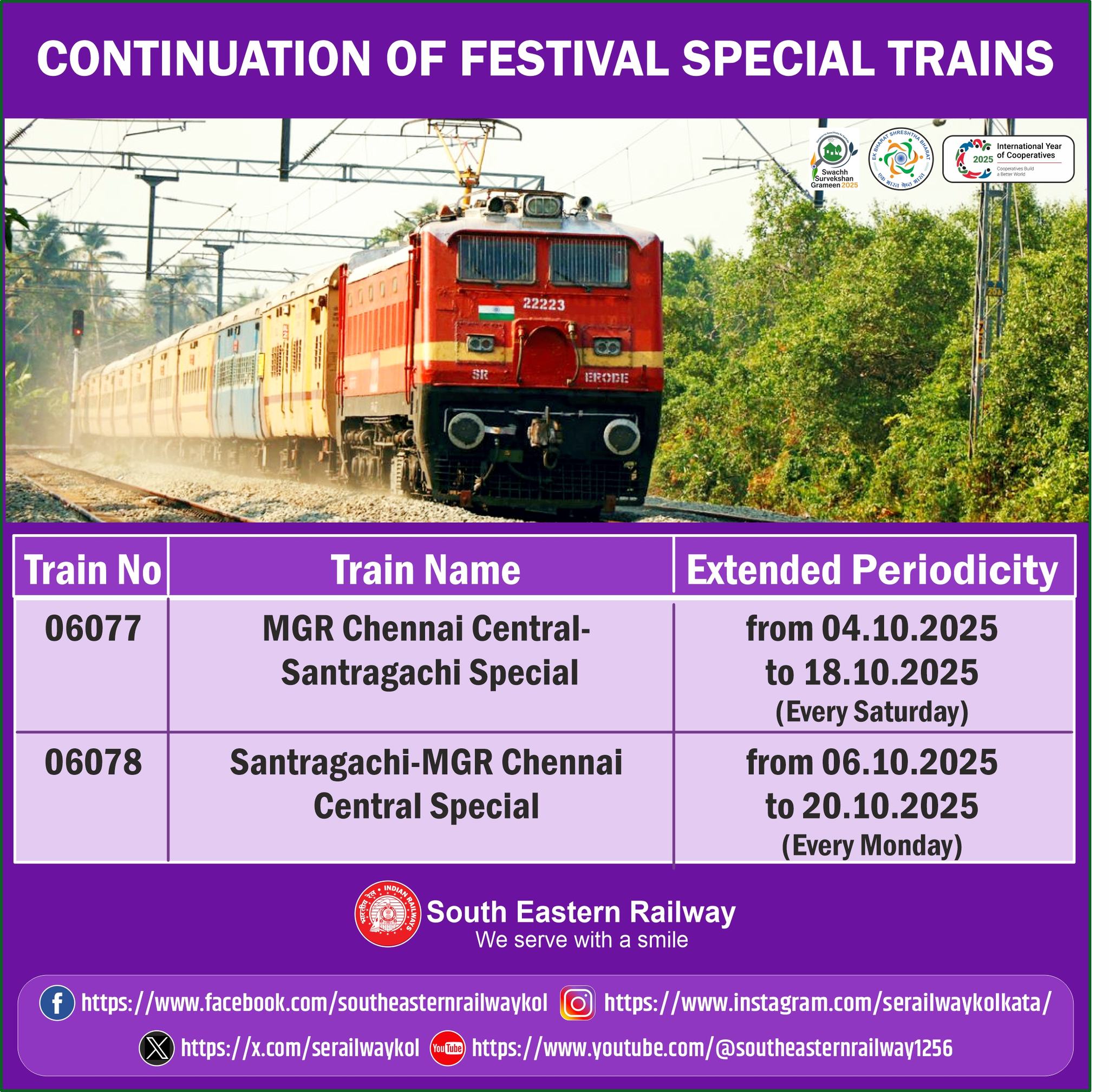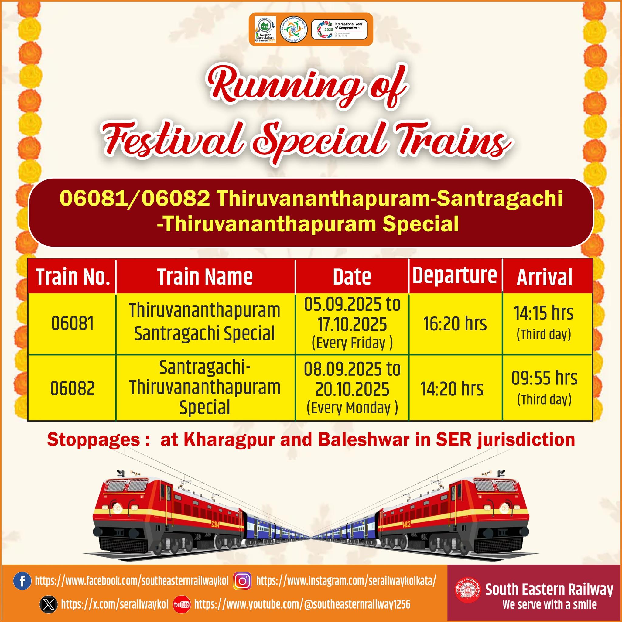 06081 Thiruvananthapuram-Santragachi Special will leave Thiruvananthapuram on every Friday from 05.09.2025 to 17.10.2025 at 16:20 hrs and will reach Santragachi at 14:15 hrs, the third day. In the return direction, 06082 Santragachi-Thiruvananthapuram Special will leave Santragachi on every Monday from 08.09.2025 to 20.10.2025 at 14:20 hrs and will arrive Thiruvananthapuram at 09:55 hrs, the third day.The Special train will have stoppages at Kharagpur and Baleshwar in SER jurisdiction.