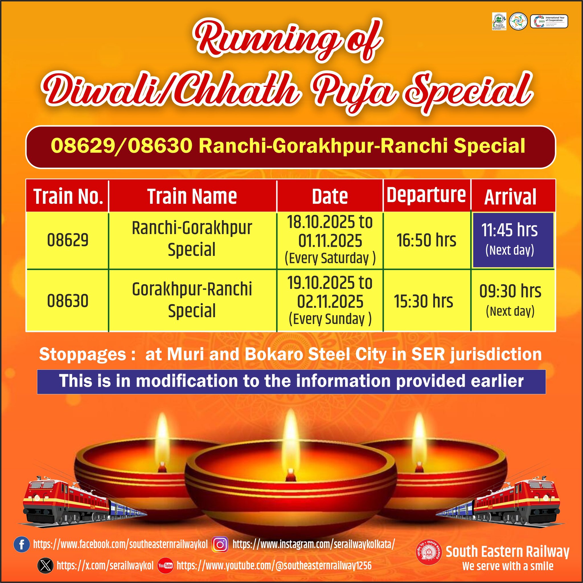 To clear extra rush of the passengers during Diwali/Chhath, it has been decided to run 08629/08630 Ranchi-Gorakhpur-Ranchi Special trains as per the following schedule: 08629 Ranchi-Gorakhpur Special will leave Ranchi on every Saturday from 18.10.2025 to 01.11.2025 at 16:50 hrs and will reach Gorakhpur at 11:30 hrs, the next day. In the return direction, 08630 Gorakhpur-Ranchi will leave Gorakhpur on every Sunday from 19.10.2025 to 02.11.2025 at 15:30 hrs and will reach Ranchi at 09:30 hrs, the next day.The Special train will have stoppages at Muri and Bokaro Steel City in South Eastern Railway jurisdiction.