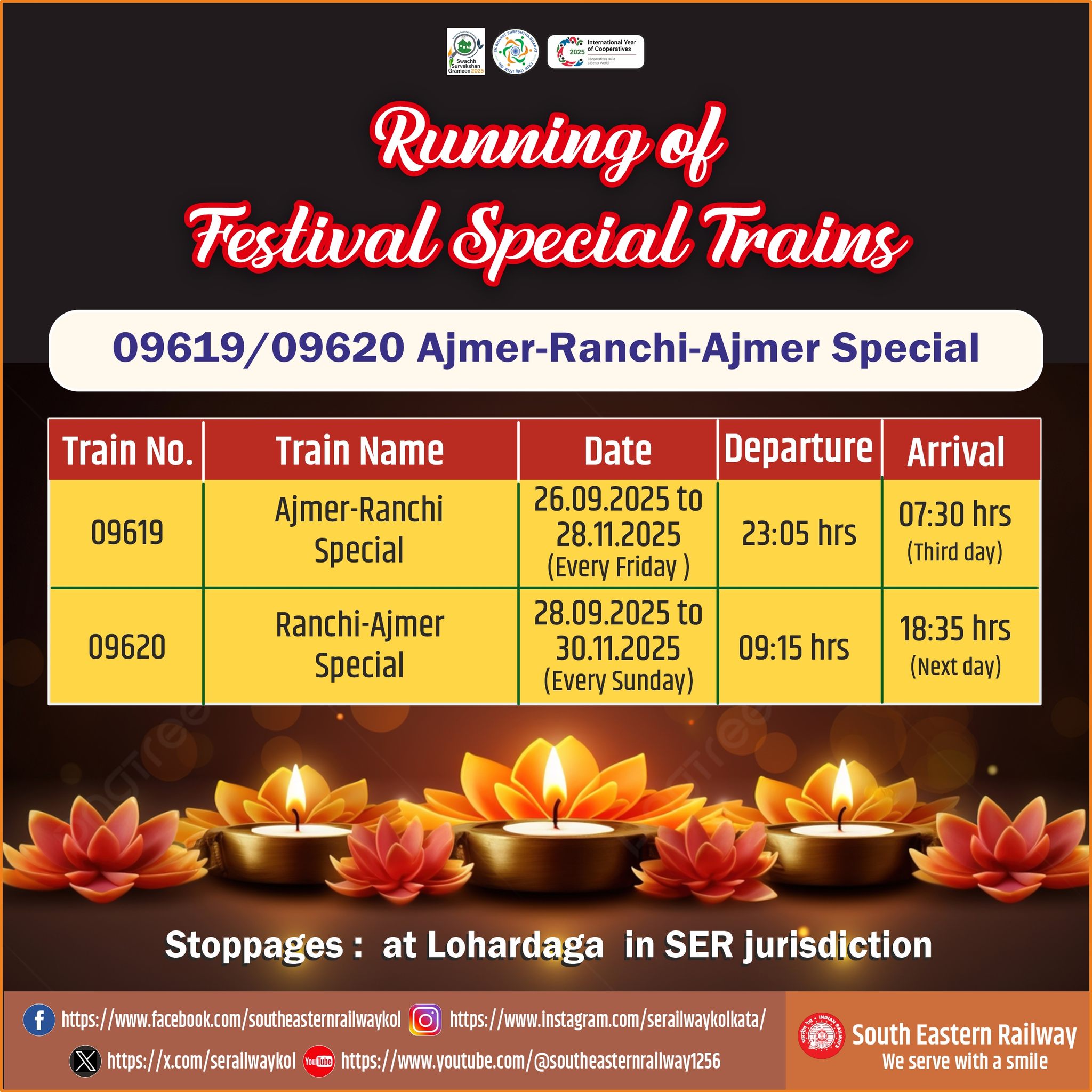 09619 Ajmer-Ranchi Special will leave Ajmer on every Friday from 26.09.2025 to 28.11.2025 at 23:05 hrs and will reach Ranchi at 07:30 hrs, the third day. In the return direction, 09620 Ranchi-Ajmer Special will leave Ranchi on every Sunday from 28.09.2025 to 30.11.2025 at 09:15 hrs and will arrive Ajmer at 18:35 hrs, the next day.The Special train will stop at Lohardaga in SER jurisdiction.