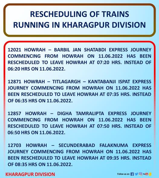 दक्षिण पूर्व रेलवे ने 11 जून को हावड़ा से खुलने वाली हावड़ा- बड़बिल जनशताब्दी एक्सप्रेस सहित कुछ ट्रेंनों को रिशिड्यूल किया गया है. इसको लेकर दक्षिण पूर्व रेलवे ने अधिसुचना जारी कर दी है. अधिसुचना के मुताबिक गाड़ी संख्या 12021 हावड़ा – बड़बिल जनशताब्दी एक्सप्रेस सुबह 6.20 मिनट के स्थान पर एक घंटे देरी से यानि सुबह 7.20 मिनट में प्रस्थान करेगी.वही गाड़ी संख्या 12222 हावड़ा -पूणें दुरंतो एक्सप्रेस हावड़ा से सुबह 5.45 के जगह एक घंटे देरी से सुबह 6.45 मिनट में प्रस्थान करेगी. वही 12871 हावड़ा -टिटलागढ़- कांटाबाजी इस्पात एक्सप्रेस हावड़ा से सुबह 6.35 मिनट की जगह एक घंटे देरी से 7.35 मिनट में प्रस्थान करेगी.वही गाड़ी संख्या 12857 हावड़ा – दीधा तमरलीपता एक्सप्रेस हावड़ा से सुबह 6.50 की जगह एक घंटा देरी से सुबह 7.50 मिनट में प्रस्थान करेगी. इसके अलावे 12703 हावड़ा – सिकदराबाद फलकनूमा एक्सप्रेस सुबह 8.35 की जगह सुबह 9.35 मिनट में प्रस्थान करेगी.